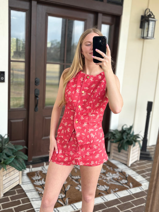 Red Western Print Skort Set