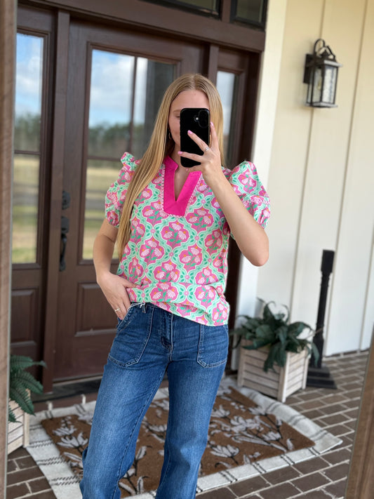 Pink and Green Floral Blouse