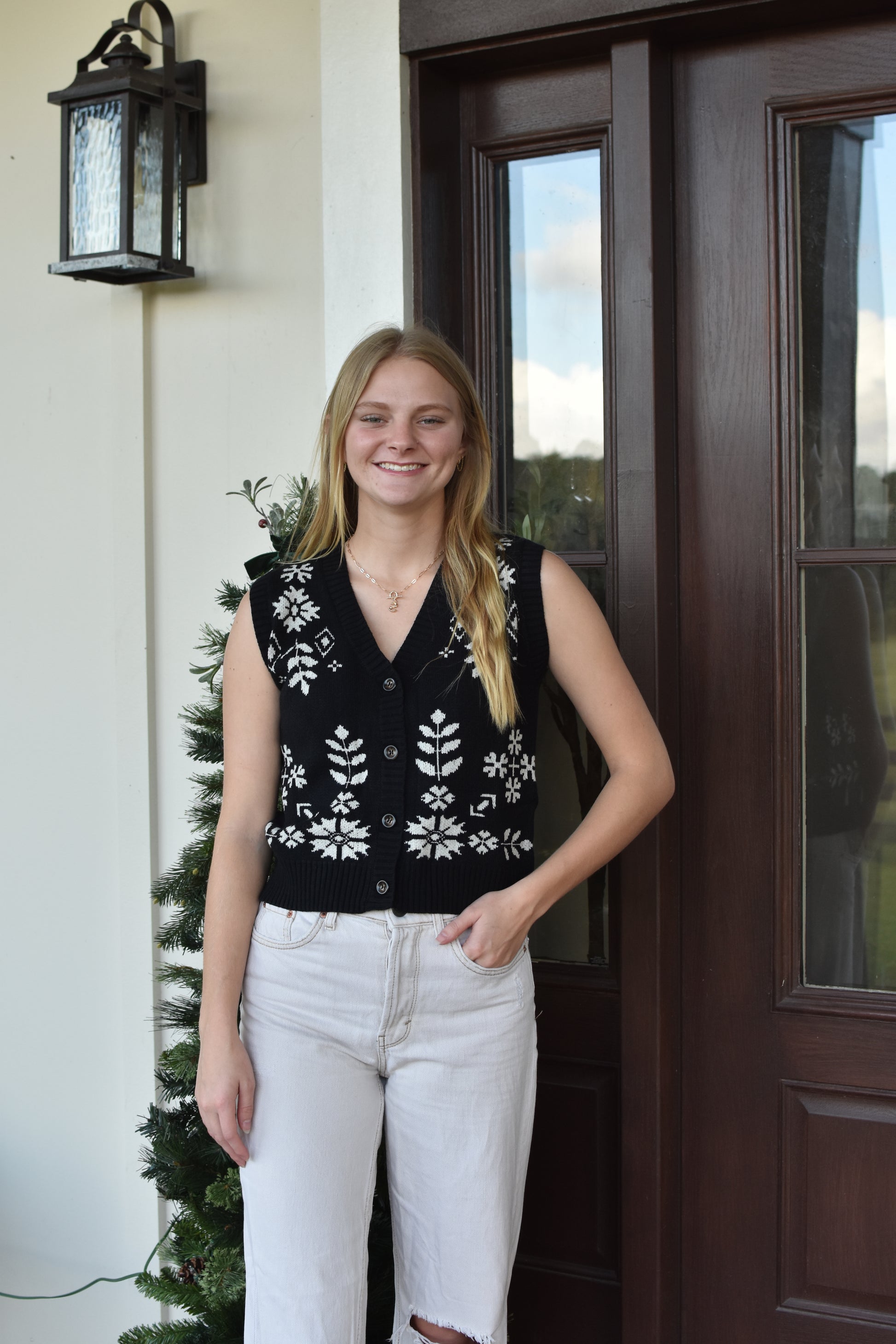 Black Floral Print Button Vest