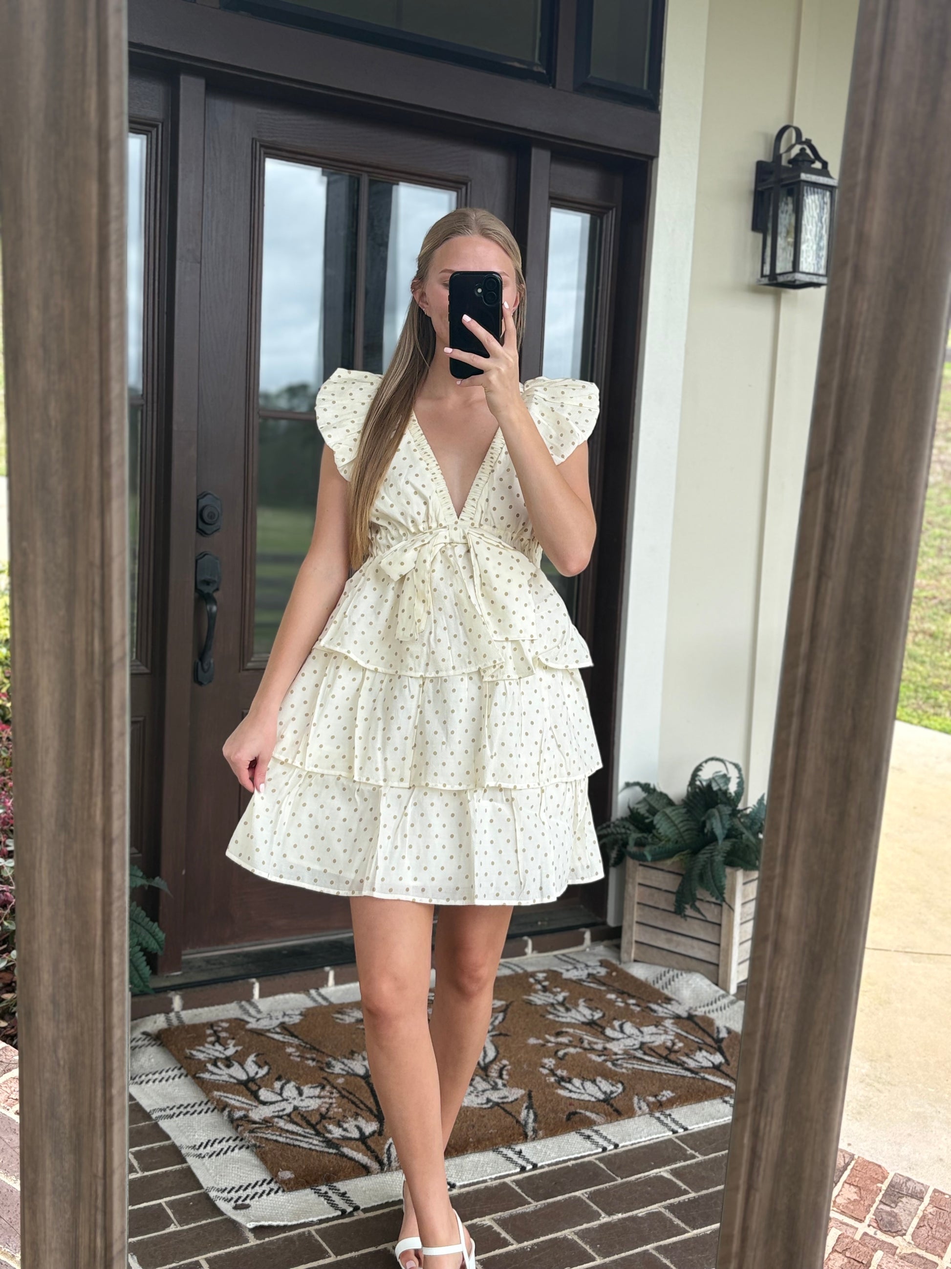 Polka dot cap puff sleeve v neck w/ bow tie layered mini